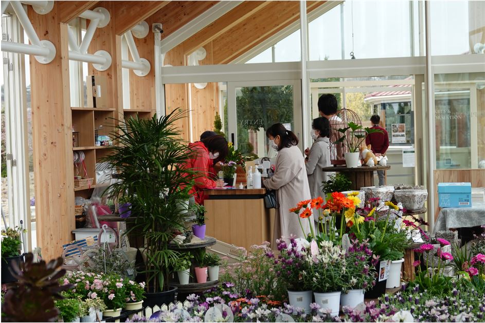 4枚目の写真はファームエントランスの写真です。ファームエントランスは入場ゲートでもあり、様々なハーブ苗や花苗などを販売しております!ガラス張りになっており、開放的な空間となっていますので是非足を運んでみてください。