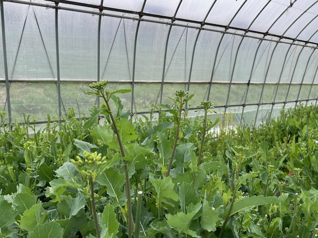 Inside the greenhouse, the daily harvest of budded greens, mizuna, chrysanthemum, and other crops is so rapid that it is impossible to keep up.