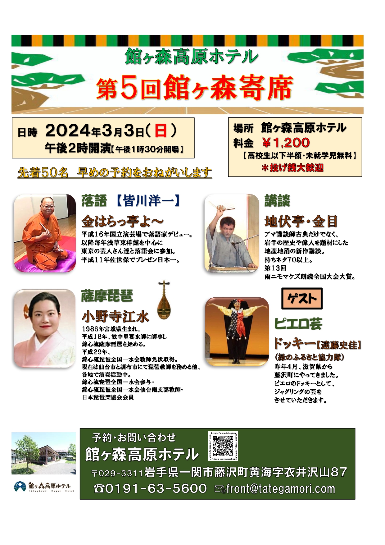 第5回館ヶ森寄席(於 館ヶ森高原ホテル)のご案内