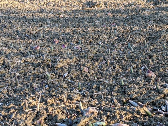 日中は少しずつ暖かくはなってきていますが、朝夕はまだまだ寒く霜柱によって球根が表面に顔を出すものもあります。