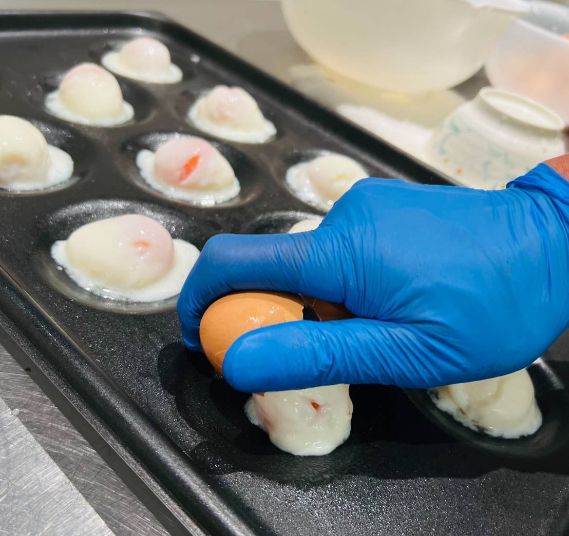 目玉焼きプレートに温玉を割り、オーブン180度で10分火入れします。