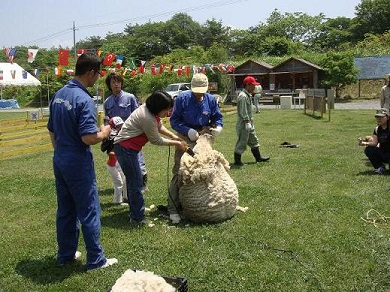 羊の毛刈り体験をしている女性の奥にひっそりと写っているのは、