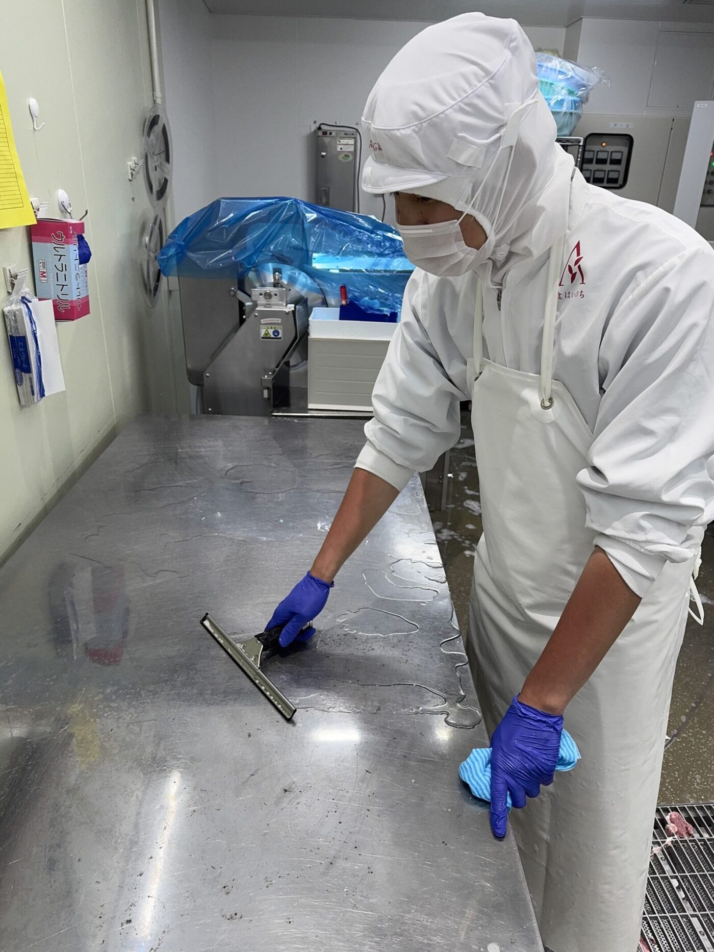 2つ目は結露・水たまりの排除です。扉の開閉が多いと室温差で結露ができてしまいます。なので、無駄な開閉はしません。そして作業台や取っ手の水滴、床の水たまりをタオルやワイパーで確実に排除しています。