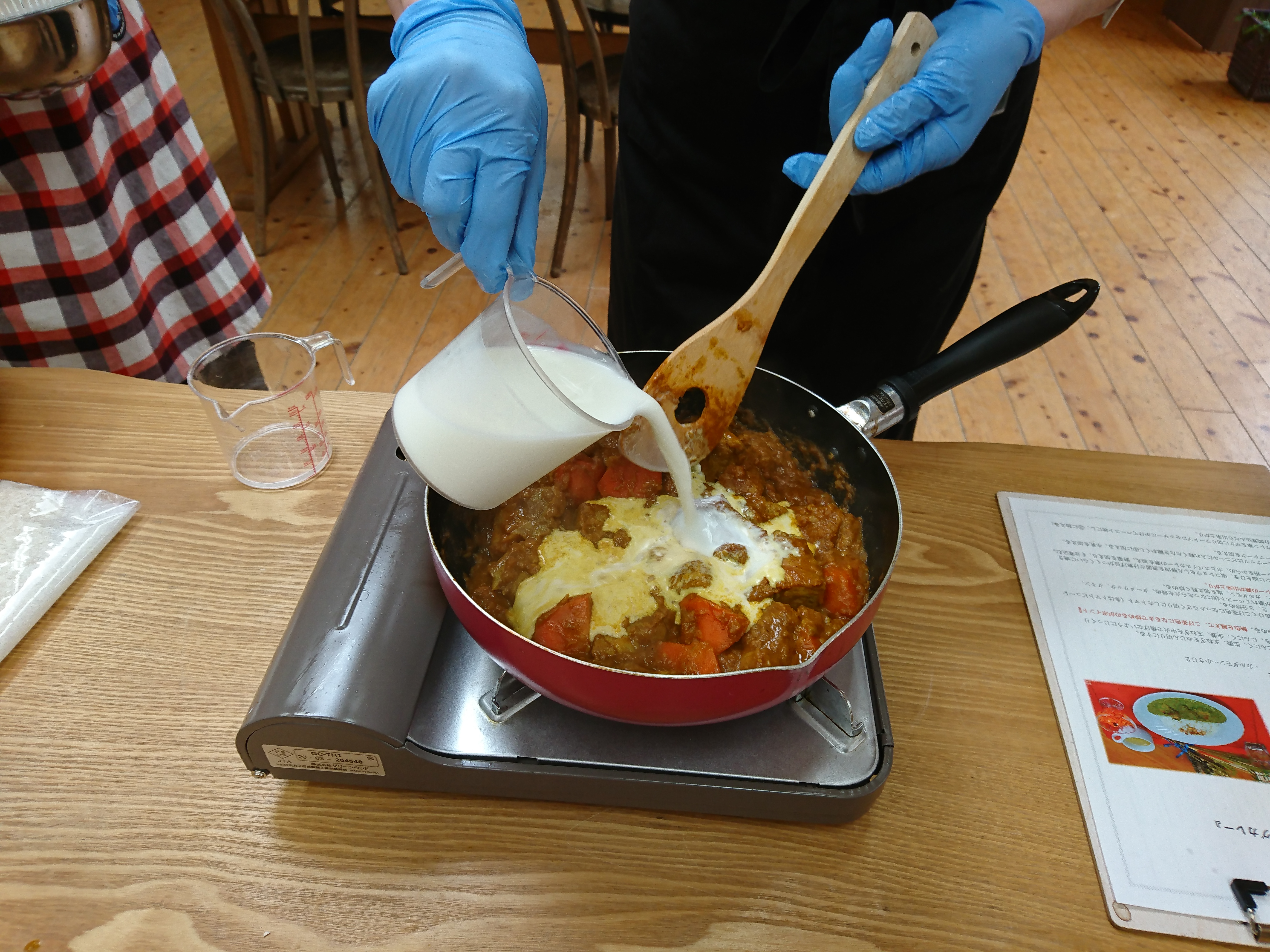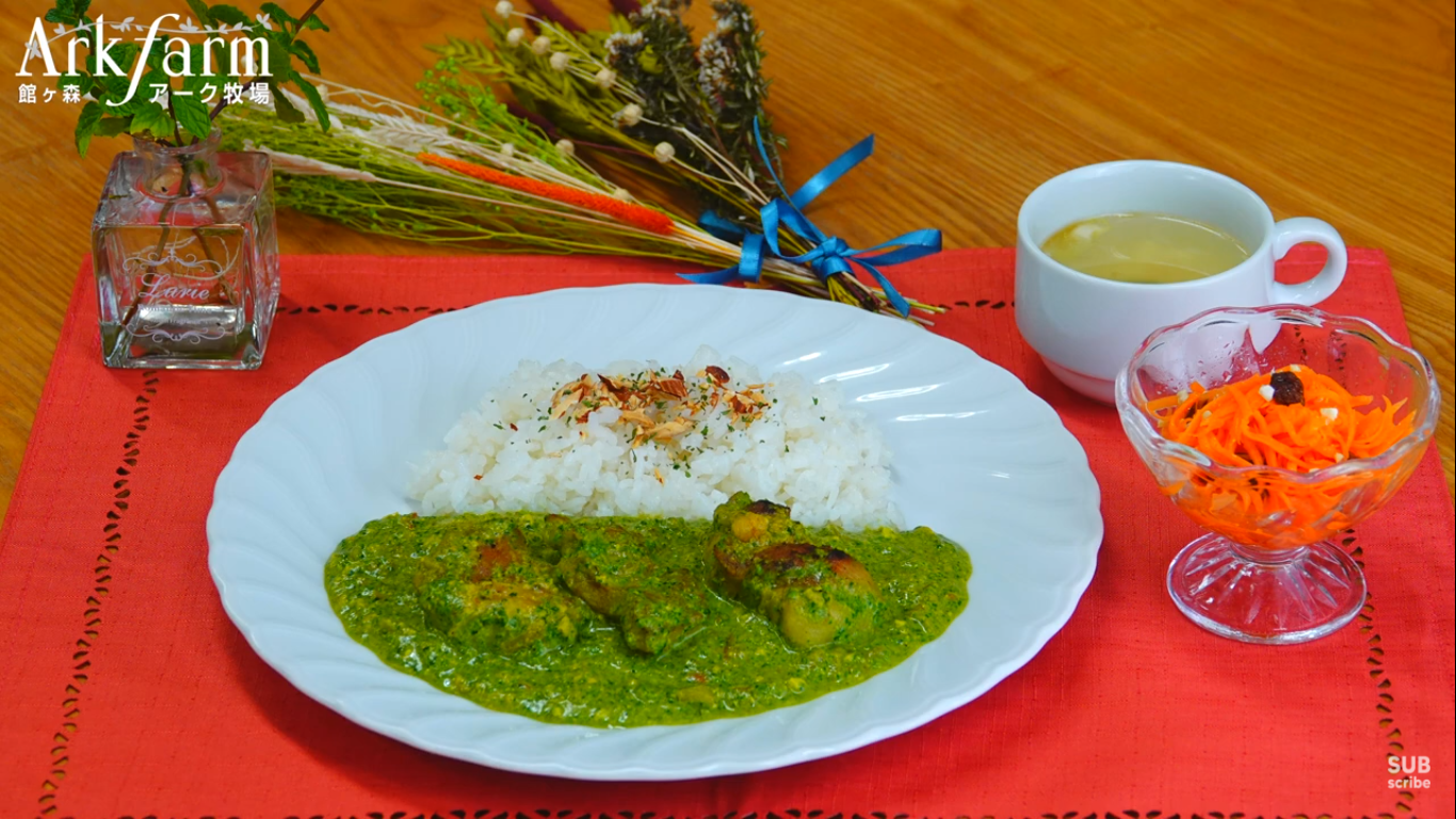 ホウレン草をペースト状にして混ぜるグリーンのカレー。