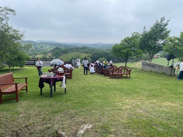 本日は、天気予報では微妙な状況でしたが、晴れることを祈願して輝きの丘展望台で人前結婚式を実施牧場を一望できるスポットでの式は、新郎新婦・ご両家にとって希望に富んだ一歩になったこと間違いなし