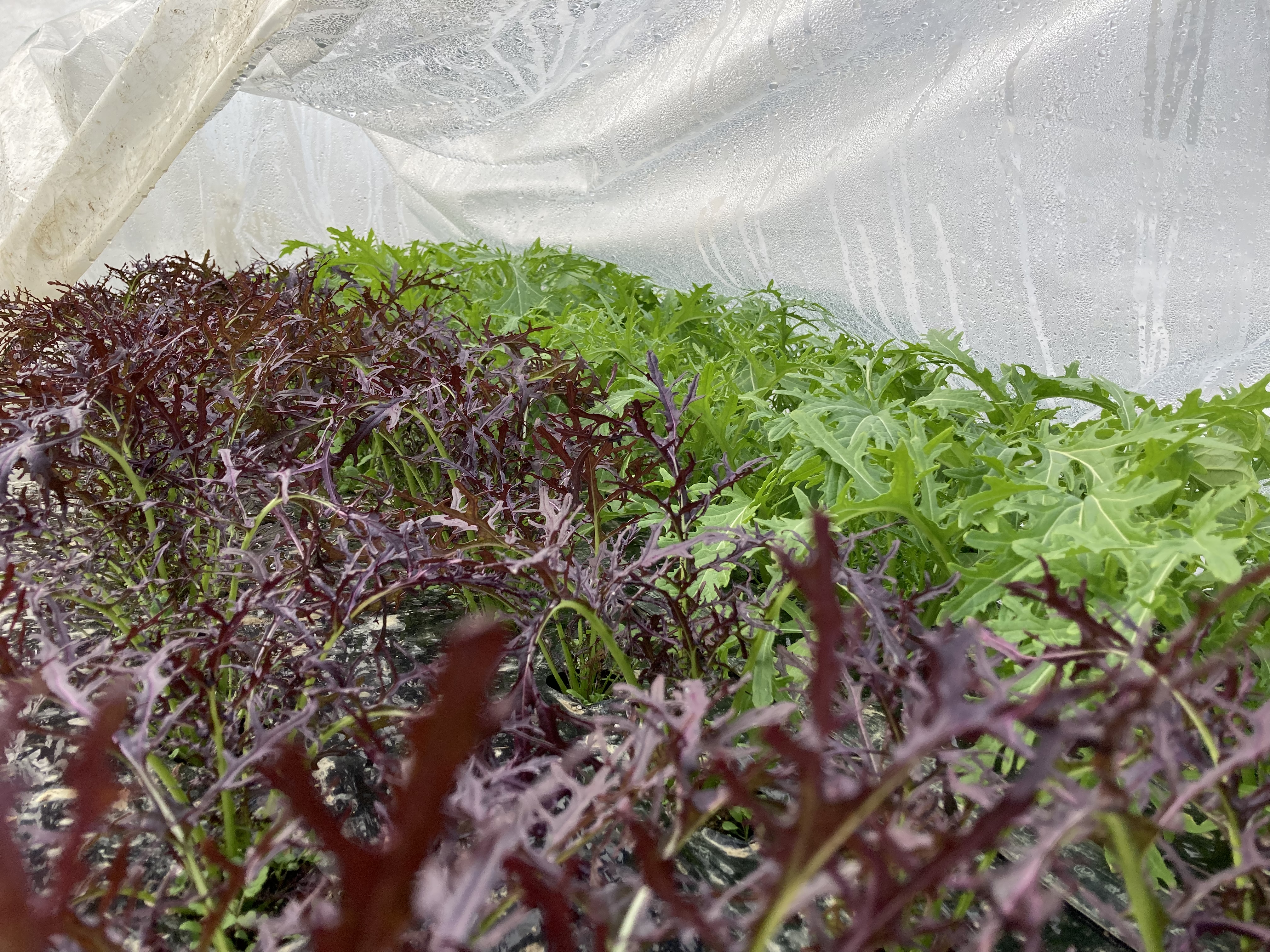 まずは葉物野菜です。ハウスの中でも冬場は寒いので、ビニールを何枚もかけてあたたかくし、生長を促進してあげています。