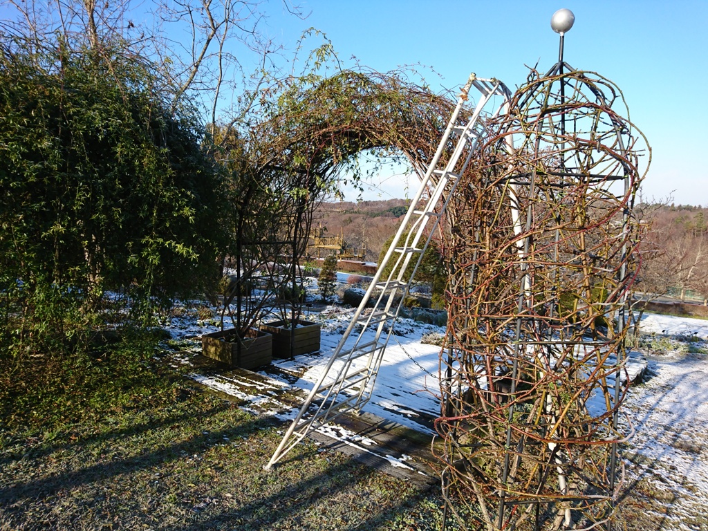 こんな寒さの中、ガーデナーは来年に向けてつるバラの誘引中