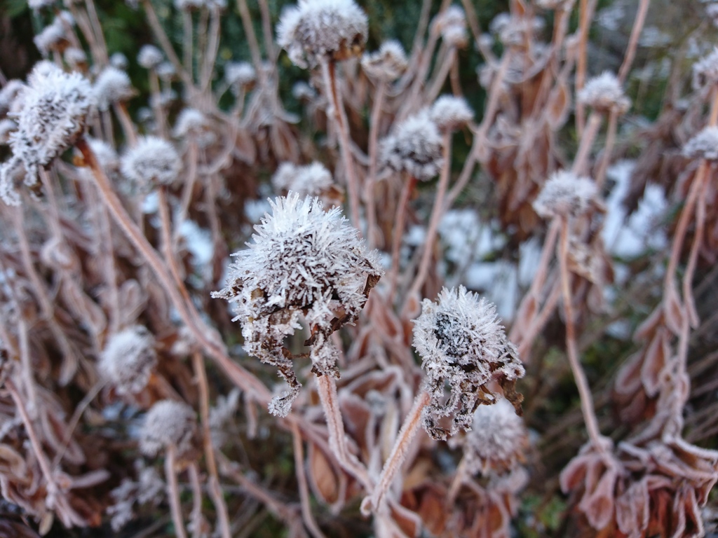 こちらは、ハマギクの開花後に霜で化粧された姿です。