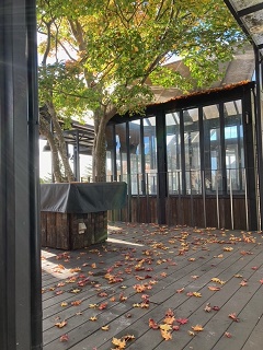バーベキューテラスのシンボルツリーでもあるモミジがやっと紅葉し、ハラハラと
