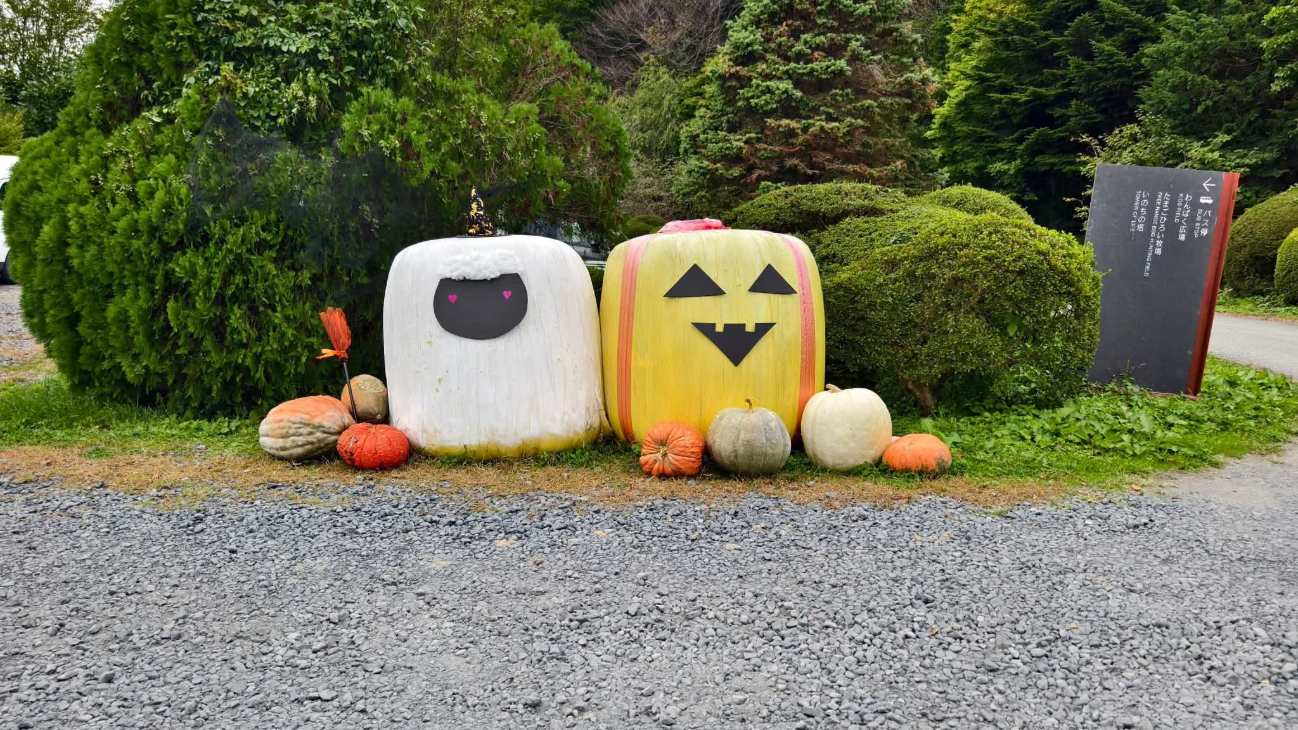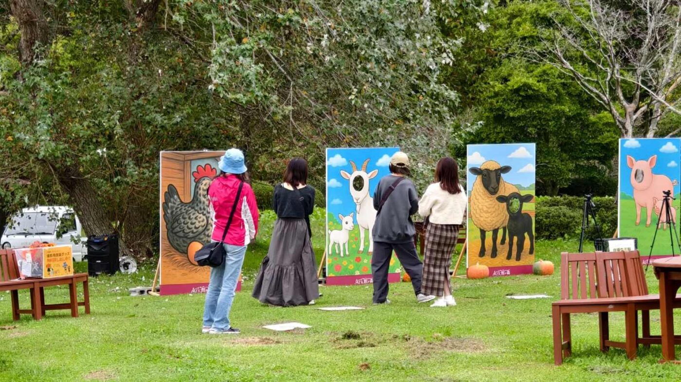 収穫祭は、園内わんぱく広場で開催されたました。大きなカボチャがお出迎え、たくさんの顔出しパネルも設置しました。Ark館ヶ森の動物になった気分で「パシャ」!