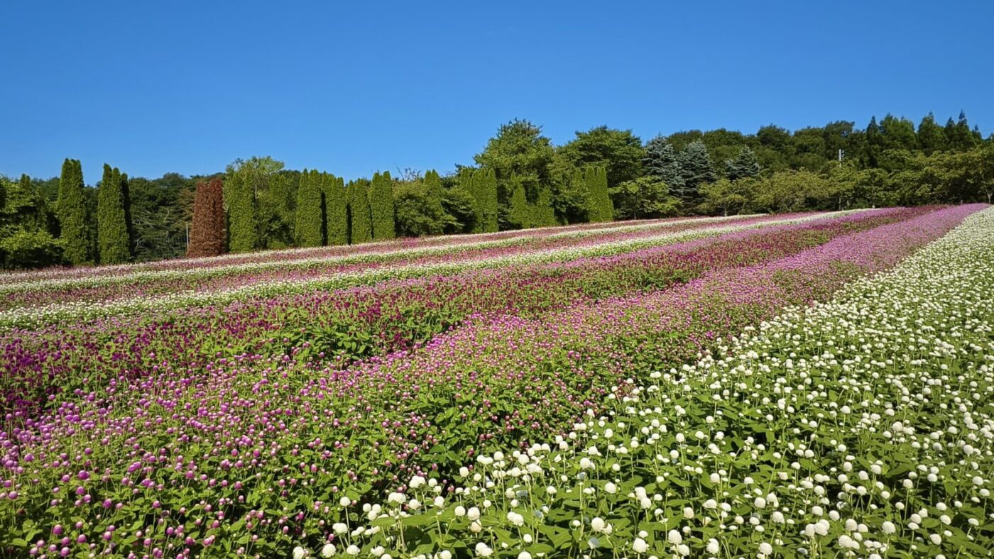 虹の丘ガーデンでは、約15,000株の千日紅が一面に咲き誇り、赤やピンク、白の小さな花々が秋の風に揺れながら、まるでカーペットのように広がります。
