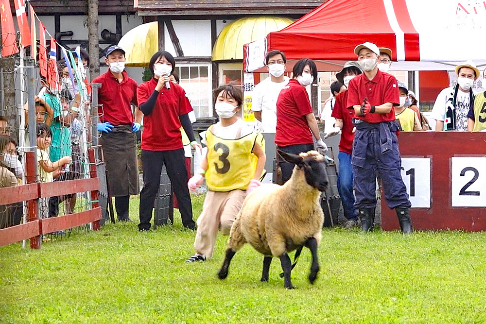 『め~め~ダービー』は牧場に設置されたコース内を参加者が子羊を追いかけながら走り、
