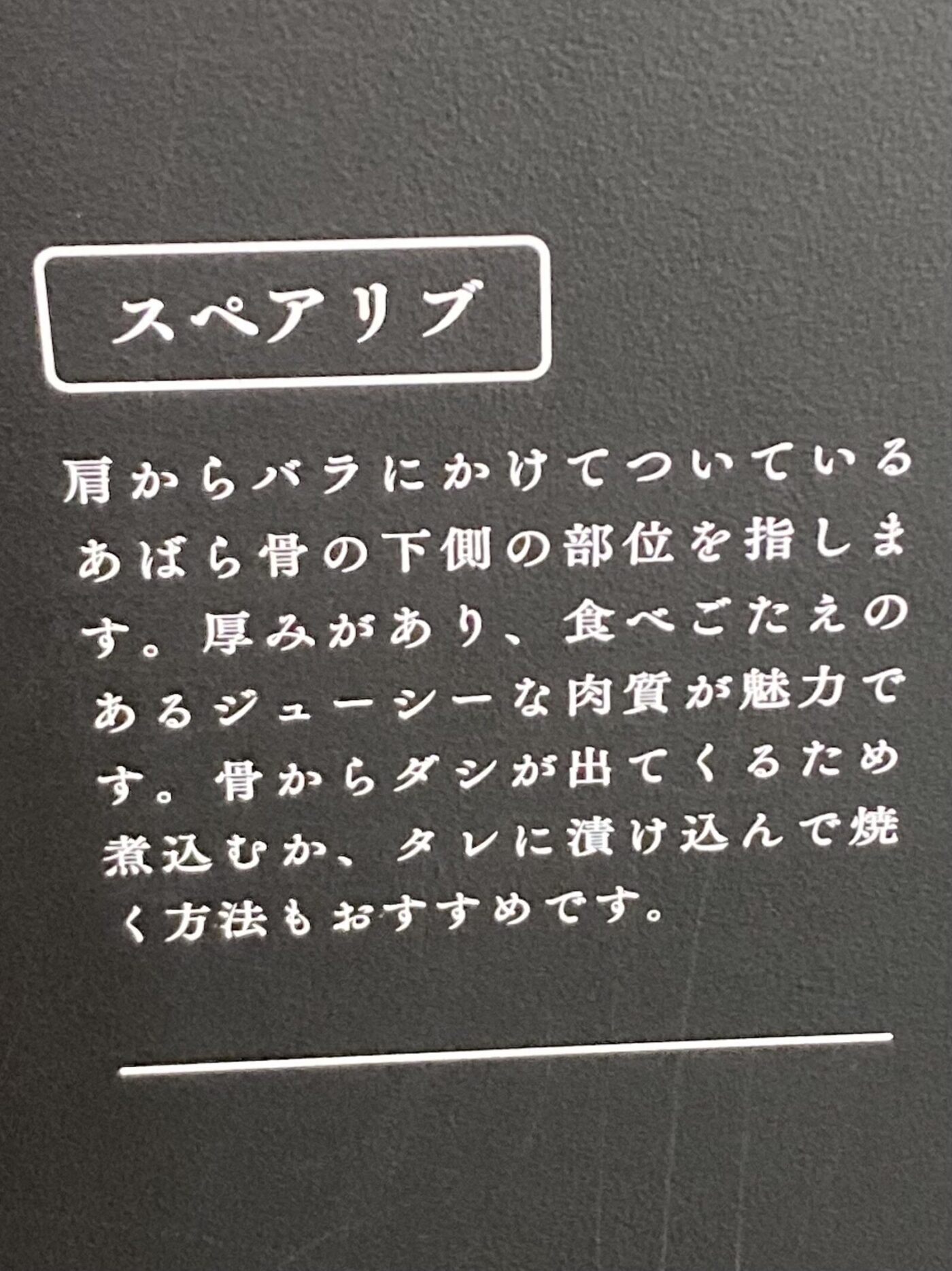 まずスペアリブとはどこの部位なのか?ということで、ファームマーケット店内に掲示してある、こちらの説明を見てみましょう。