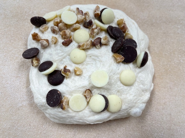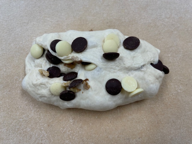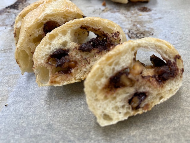 バゲット生地にダークチョコレートとホワイトチョコレート、ローストしたクルミをたっぷり巻き込んでおります。