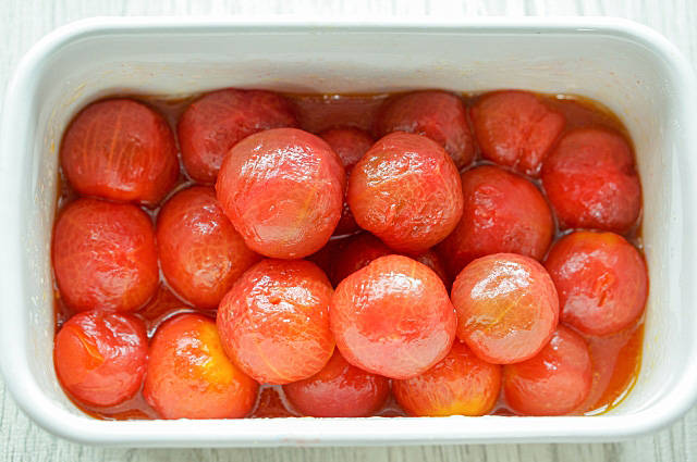 作り方はワイン、グラニュー糖、ローリエで作ったシロップにレモンスライスを入れ、湯剥きしたトマトを加え冷蔵庫で一晩冷やして出来上がりです。