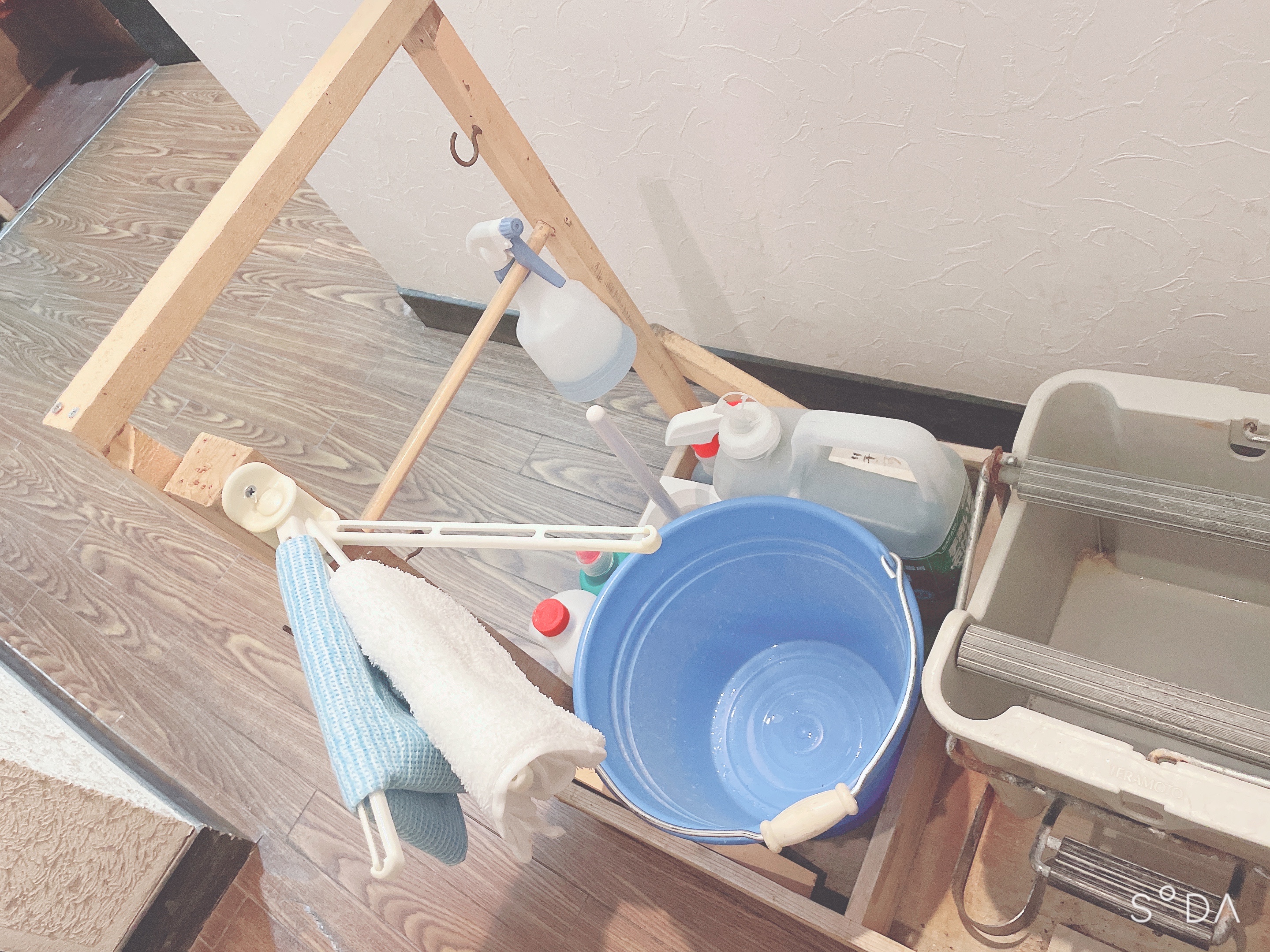 スタッフの「なんとか一度に運べたら。。」という思いから、トイレ掃除用具専用の台車を作ることに!!タオル掛けと取っ手も取り付け、収納も抜群!「一度に運べてとっても便利」とスタッフ一同大喜びの台車が完成です♪