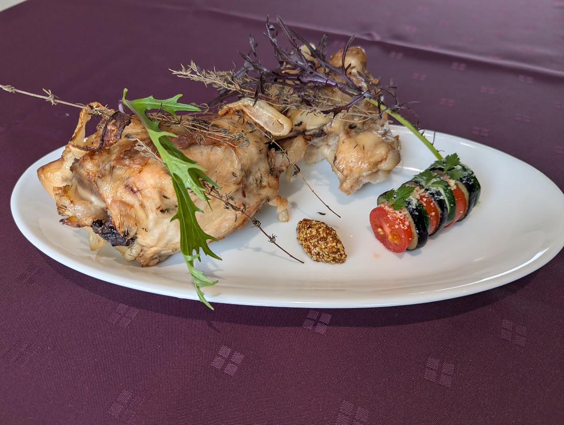 シュバイネハクセとは、ドイツの伝統的な家庭料理で、豚のすね肉をじっくりと焼き上げたローストのこと。館ヶ森高原豚の骨付きスネ肉を贅沢に使用し、外はカリッと、中はホロホロとほどけるようなジューシーな食感に仕上げました。