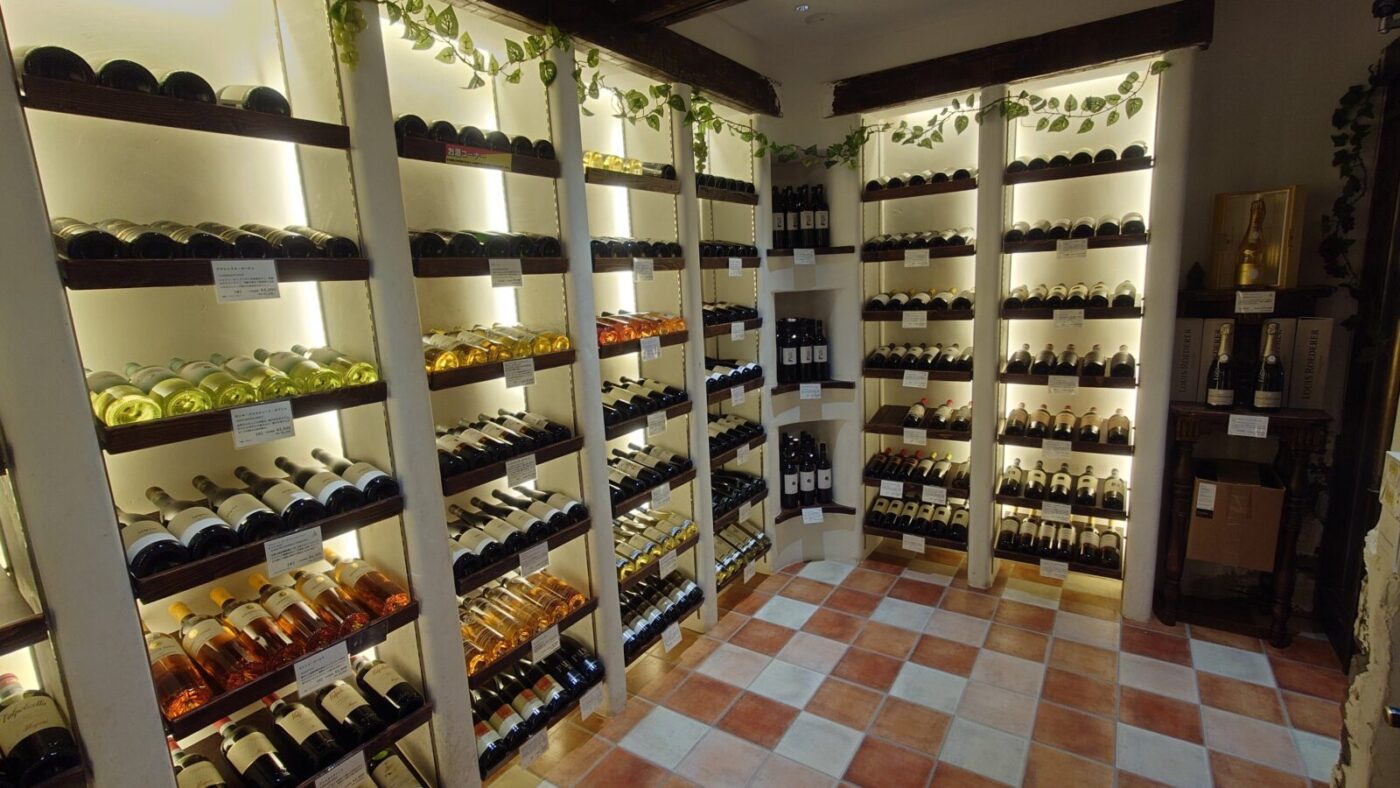 落ち着いた照明と木の棚に並ぶボトルが、ゆっくりとワイン選びを楽しめる雰囲気を演出しています。