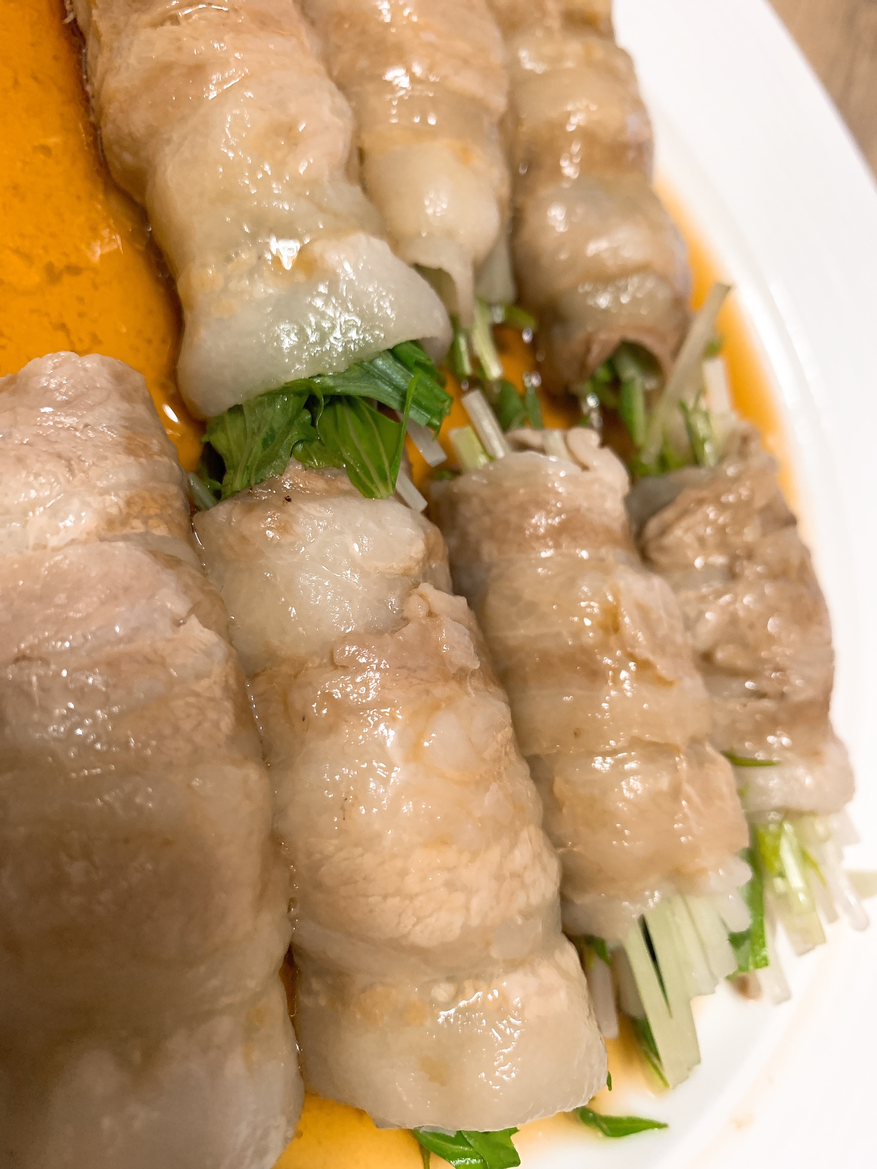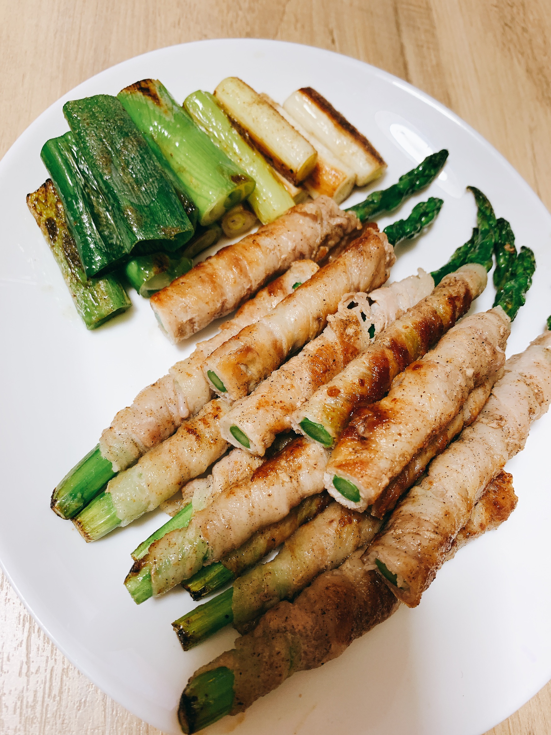 豚バラ肉の唐揚げや水菜やアスパラを館ヶ森高原豚で巻いたもの。