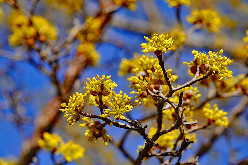 青空に映える黄色の花が鮮やかなサンシュユの林が見頃を迎えております