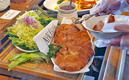 館ヶ森高原豚を使用したとんかつ用切身が販売しており、お客様からのご要望があれば牧場産の卵、小麦粉、パン粉を使用した衣が付くというものです。またレストランティルズのビュッフェにもとんかつが並んでいました。美味しいとんかつが出来上がるまでの動画がこちらです。