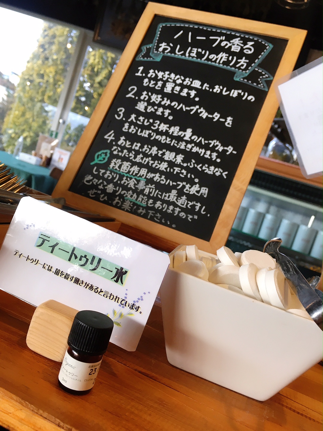 ハーブを取り扱っている当店ではハーブティー、アロマオイル、お料理へのアクセントなどさまざまありますが、自然食レストランティルズではおしぼり用のハーブウォーターとしてお食事される方に提供しております。