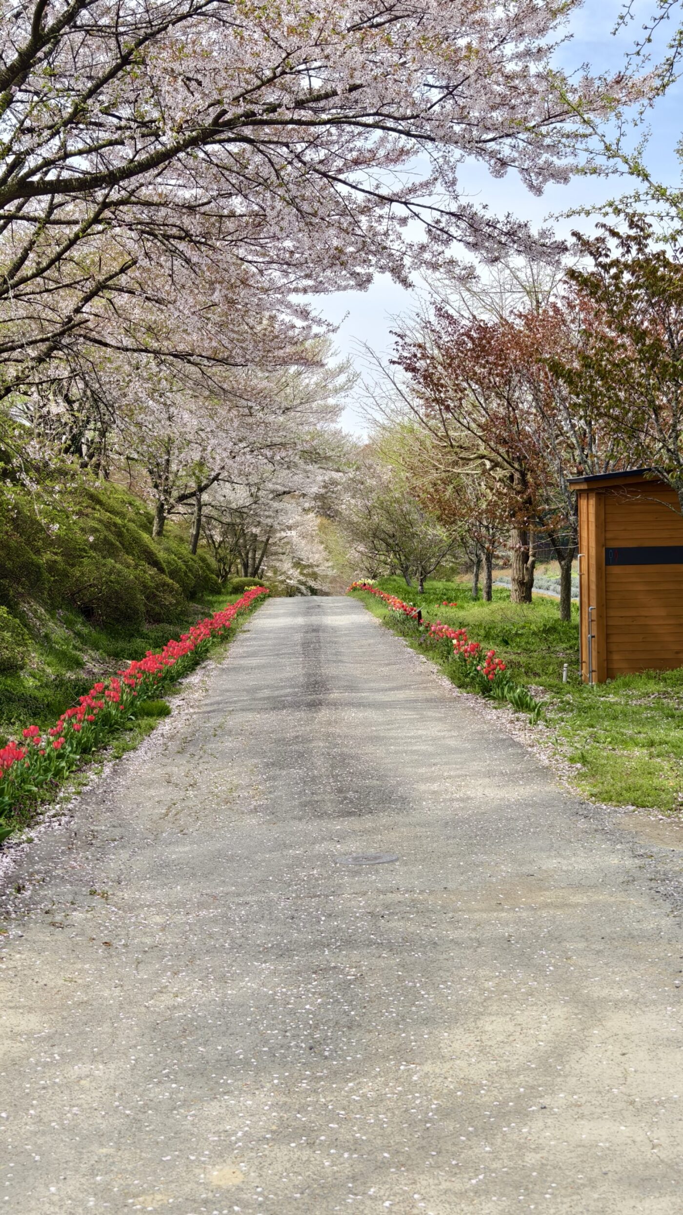 現在は、おしゃべりな1本道のチューリップが見頃を向かえており桜はソメイヨシノは散ってしまいましたが、八重桜が咲き始めてきました!