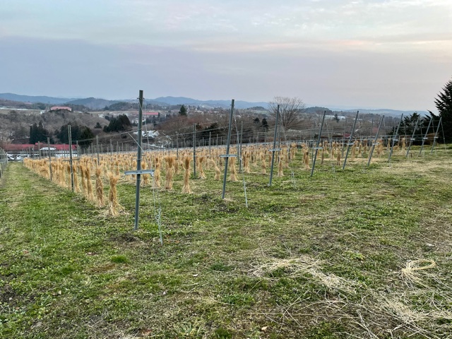 私たちの圃場が位置する岩手県南は県内では比較的暖かい地区とされていますが、初めての冬を迎える葡萄の樹のために、12月上旬に葡萄の樹に稲わらを巻いて準備万端。
