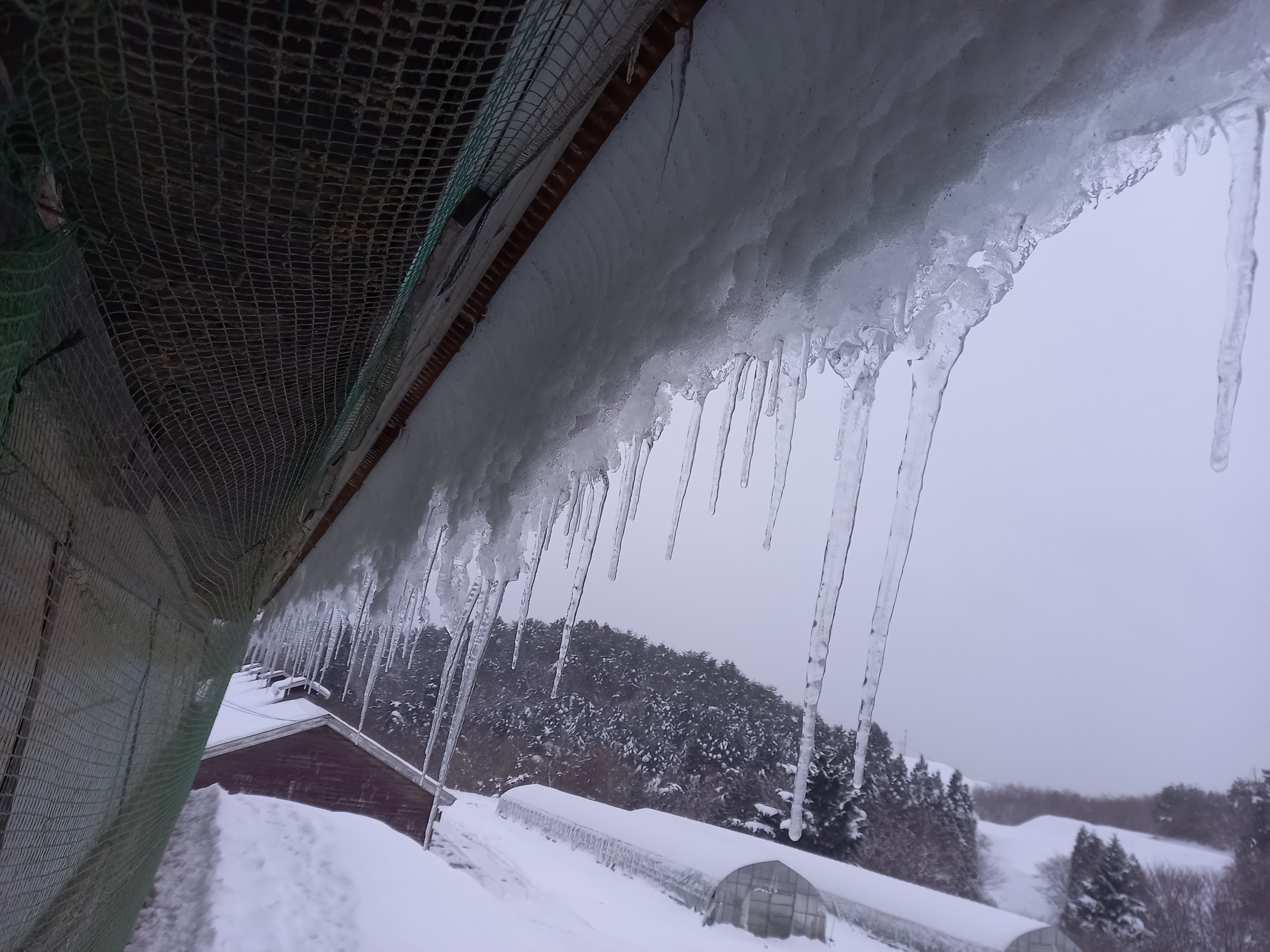 数十年ぶりに12月にまとまった雪が降り鶏舎の軒にも