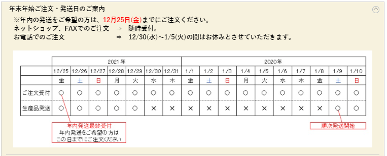 また、年明けの発送については、1月9日から順次発送致します。