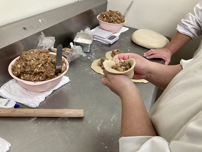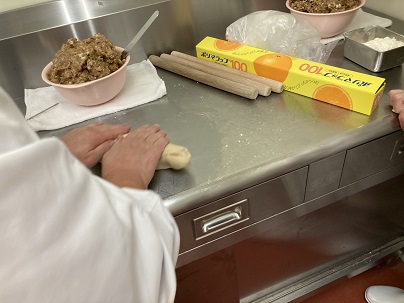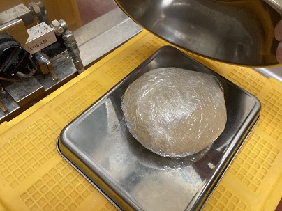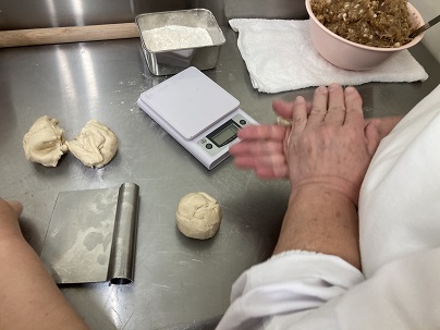 こちらも分割機械は使いませんので、1個80gずつ計量して生地を伸ばし、餡を包んでいきます。