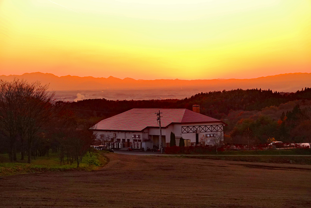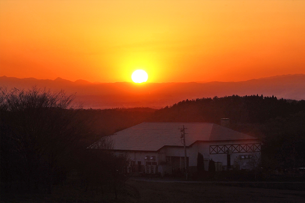 手づくり有限会社館ヶ森ハム工房の小麦畑の彼方に沈む夕日