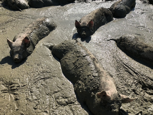 豚さんたちが自ら実践する夏場対策、それは泥浴びです。