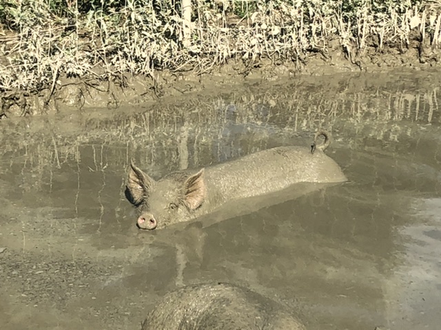 写真はだんだん干上がっていく池に浸かる豚さんたちです。