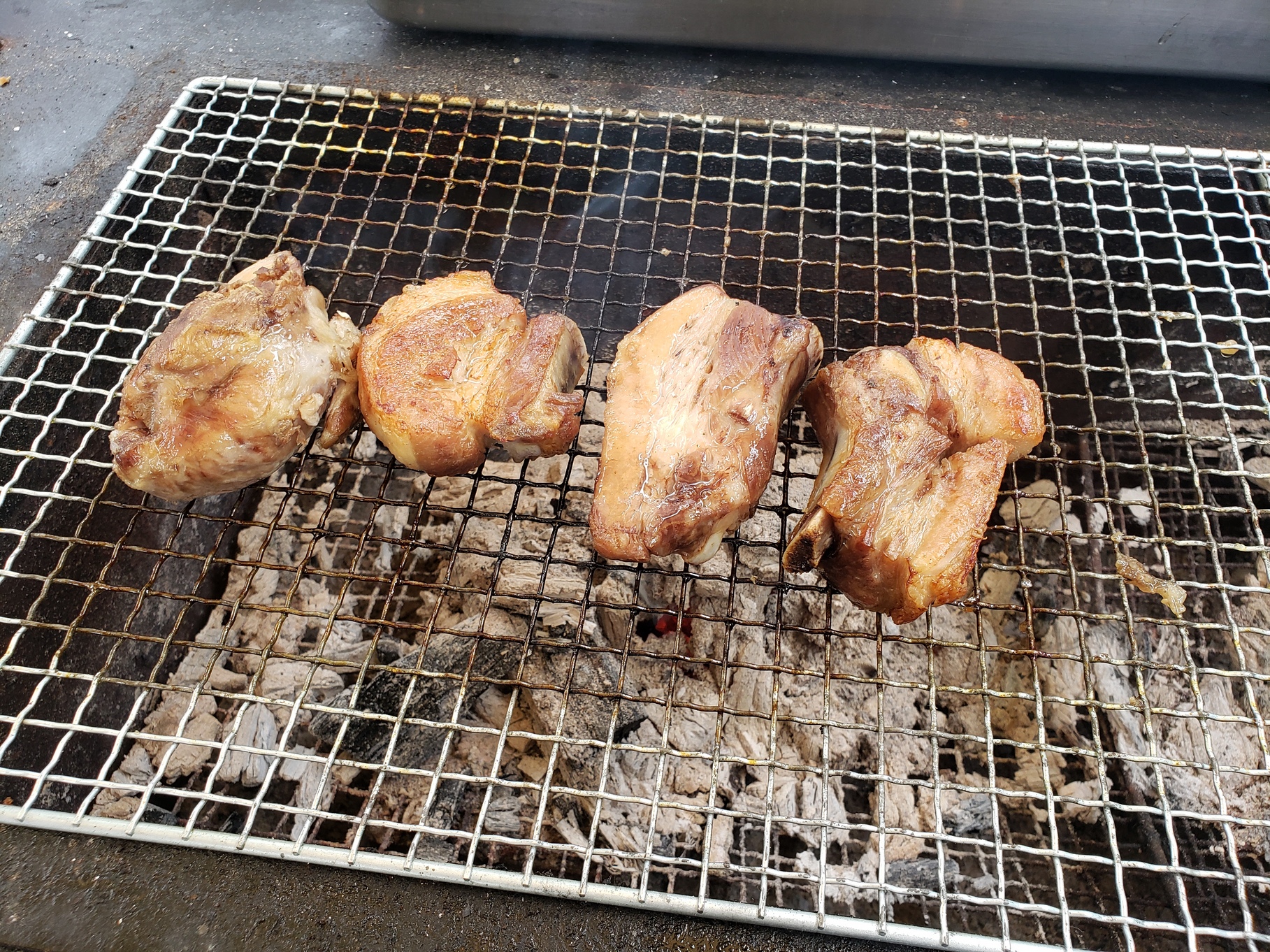 スタッフが気合を入れて炭火で焼いた館ヶ森高原豚のスペアリブとすね肉を販売!