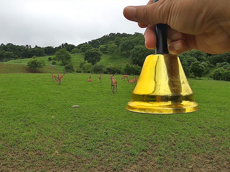 アーク牧場ではハンドベルの音でシカが寄ってくるようにトレーニングをしています。