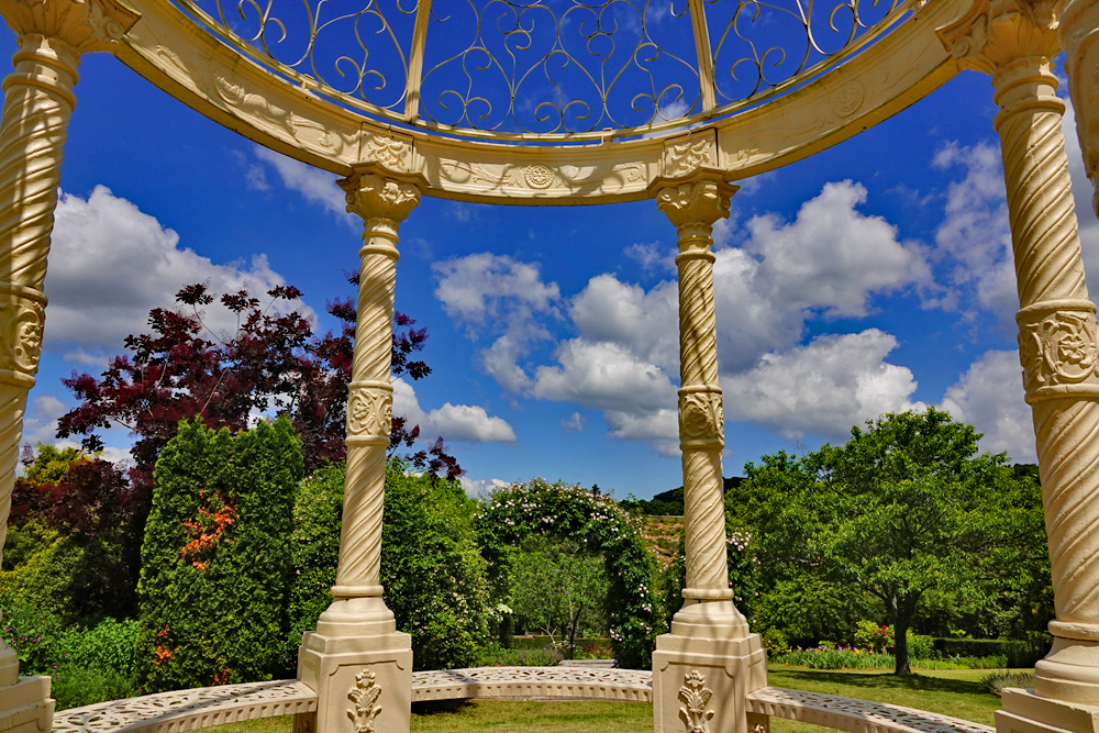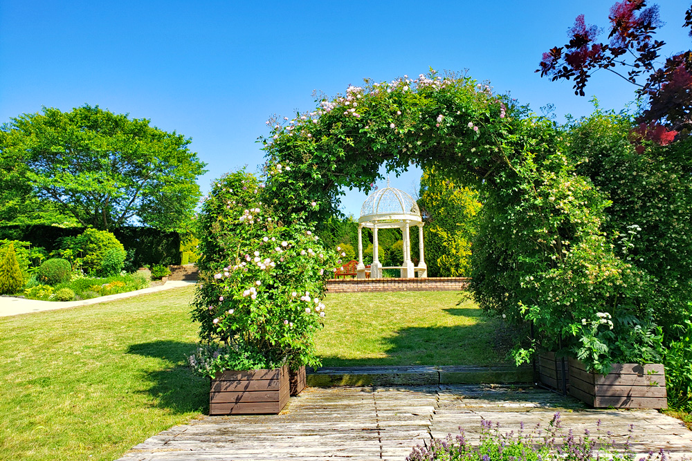 ガゼボ(西洋風あずまや)とバラのアーチが絵になりますね。