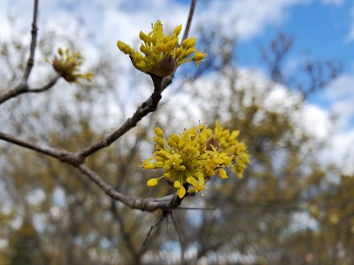 館ヶ森アーク牧場内のサンシュユ(山茱萸)が、開花し始めました!!