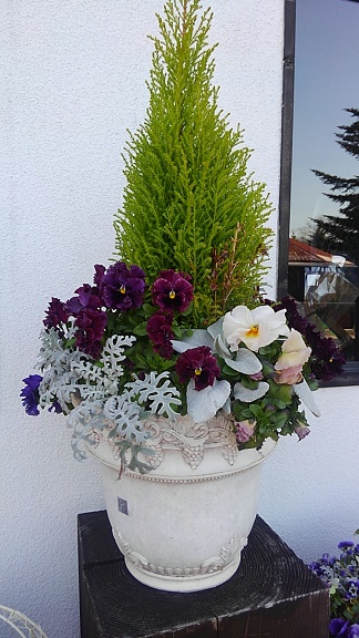 昨年11月末頃にクリスマス用と、春先に向けてと、花の寄せ植えを作って頂いたものです。