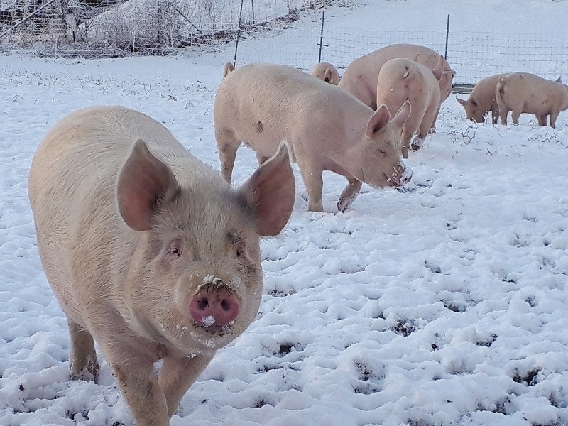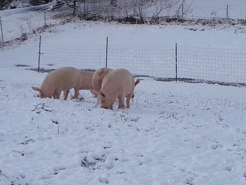 雪が降ることもありましたが、放牧豚たちはたくましく生活しています!