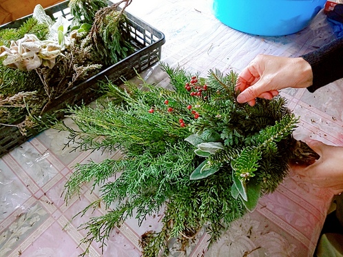 針葉樹やフレッシュバスグリーンをふんだんに使い 香りでも癒される スワッグ作り体験です。