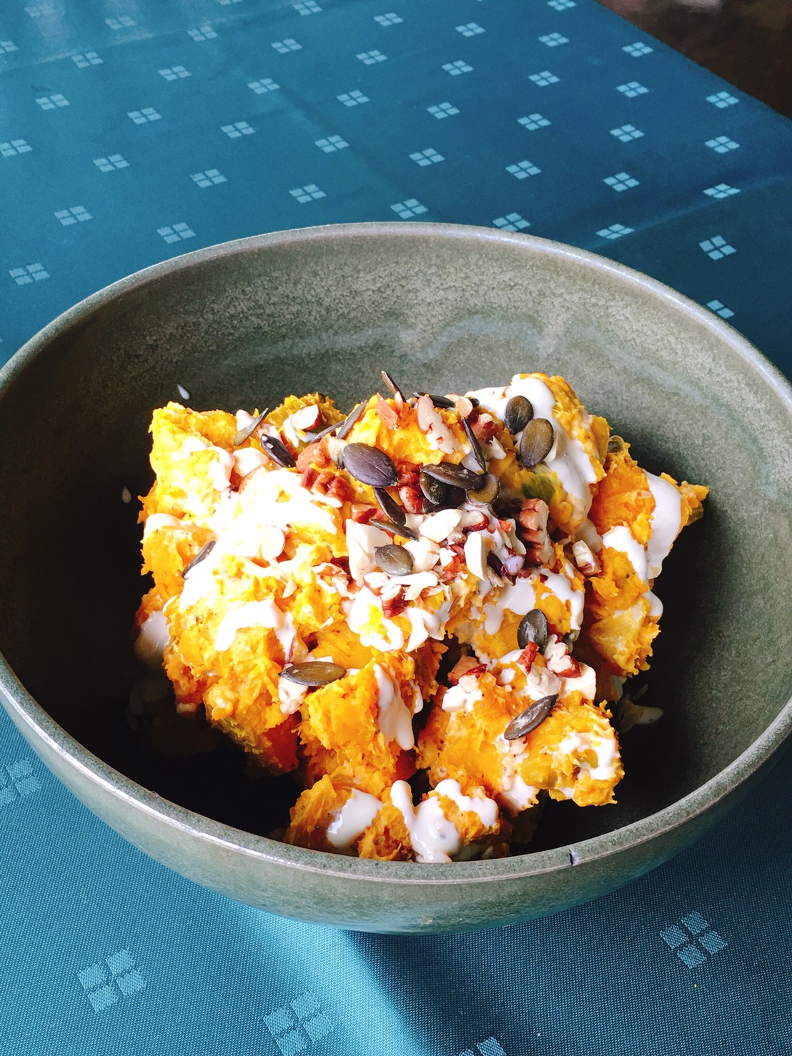 またサラダには、かぼちゃの種やナッツの粗刻みをトッピング。一緒に食べると食感も楽しめますよ。