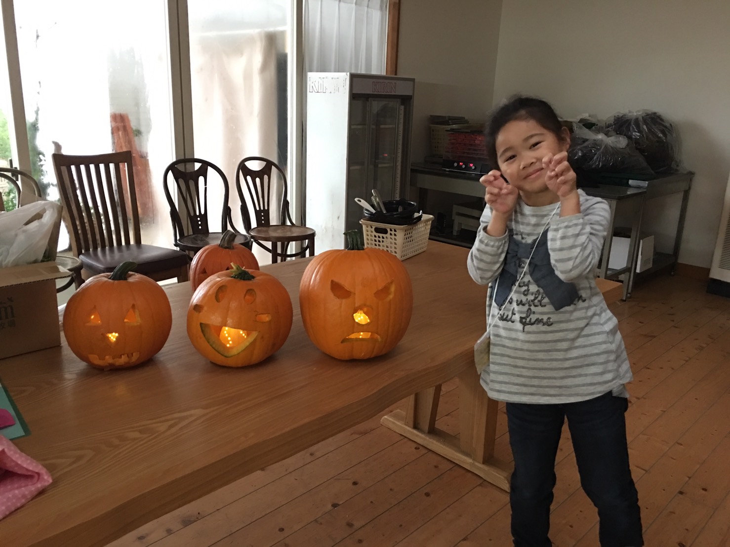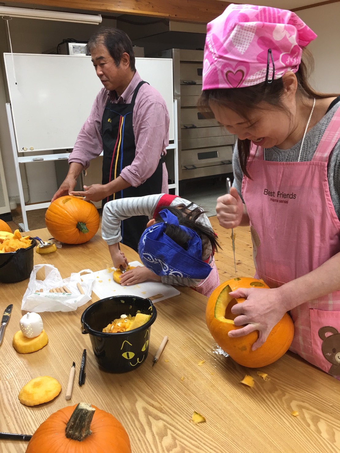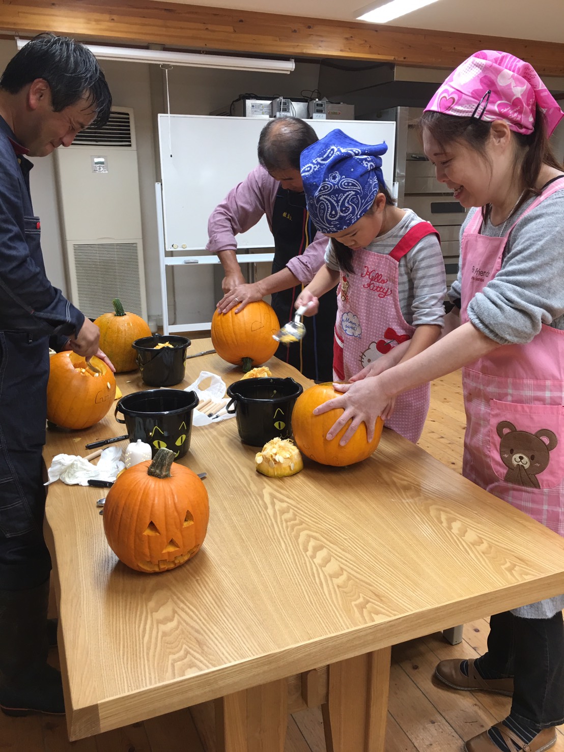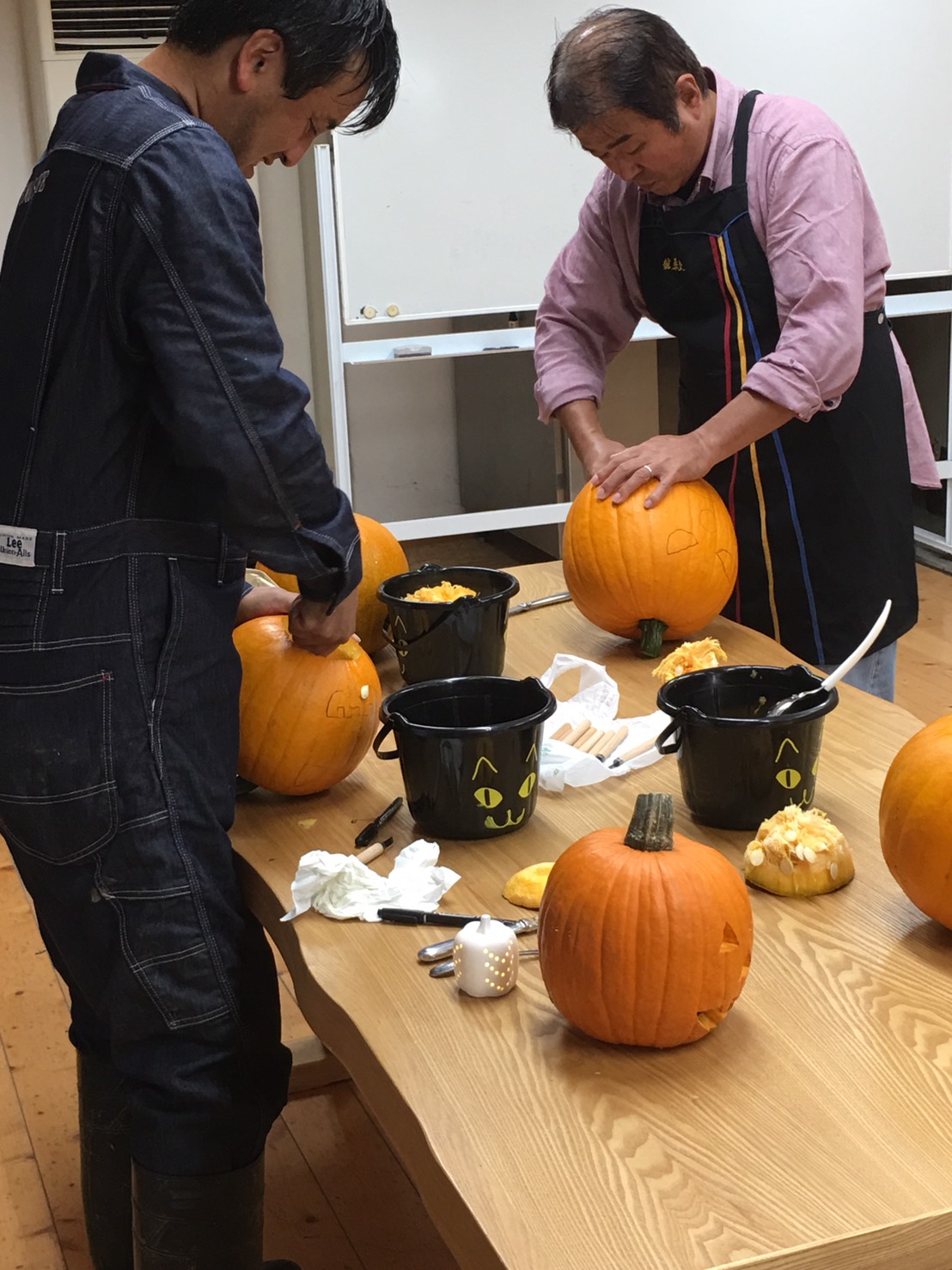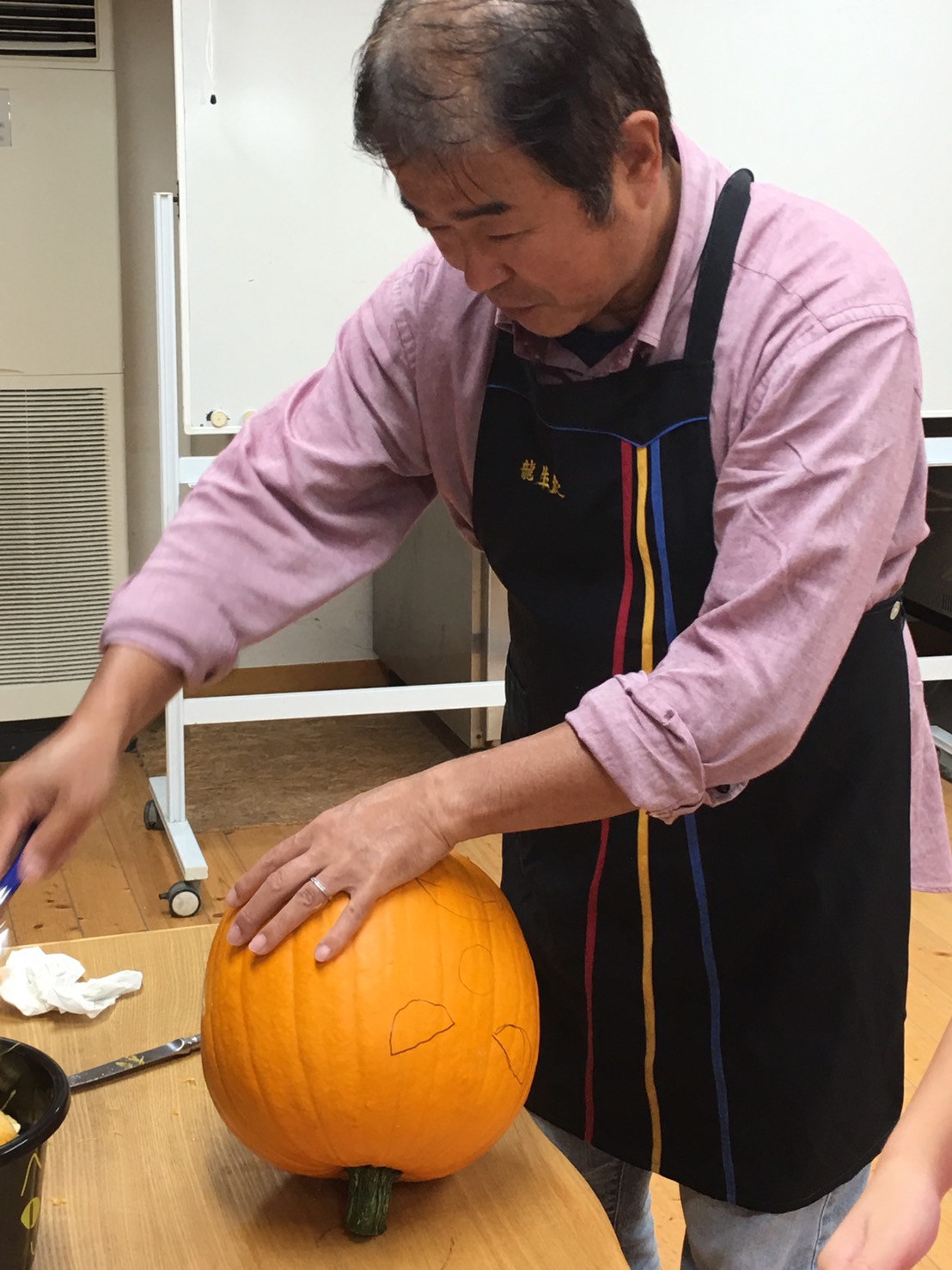 スタッフの説明を聞きながら、カボチャに顔を書き、