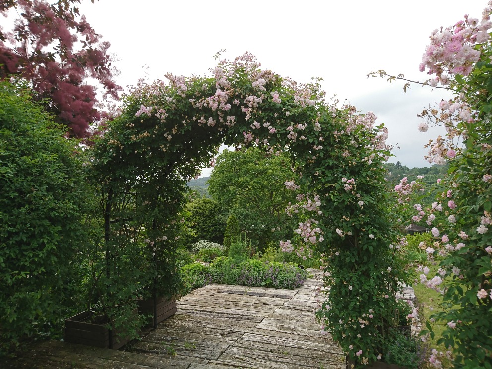 薫る風のガーデン内、ピンクの薔薇アーチ『ポールズヒマラヤンムスク』