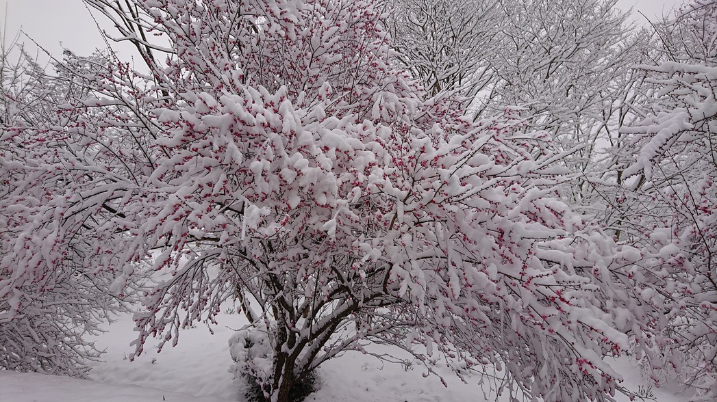 アーク牧場内の梅の花が雪におおわれてしまいました。