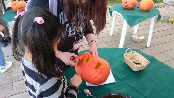 ③カボチャのランタン作り (講師役の及川勝恵さんの指導のもと、親子共同作業です。)