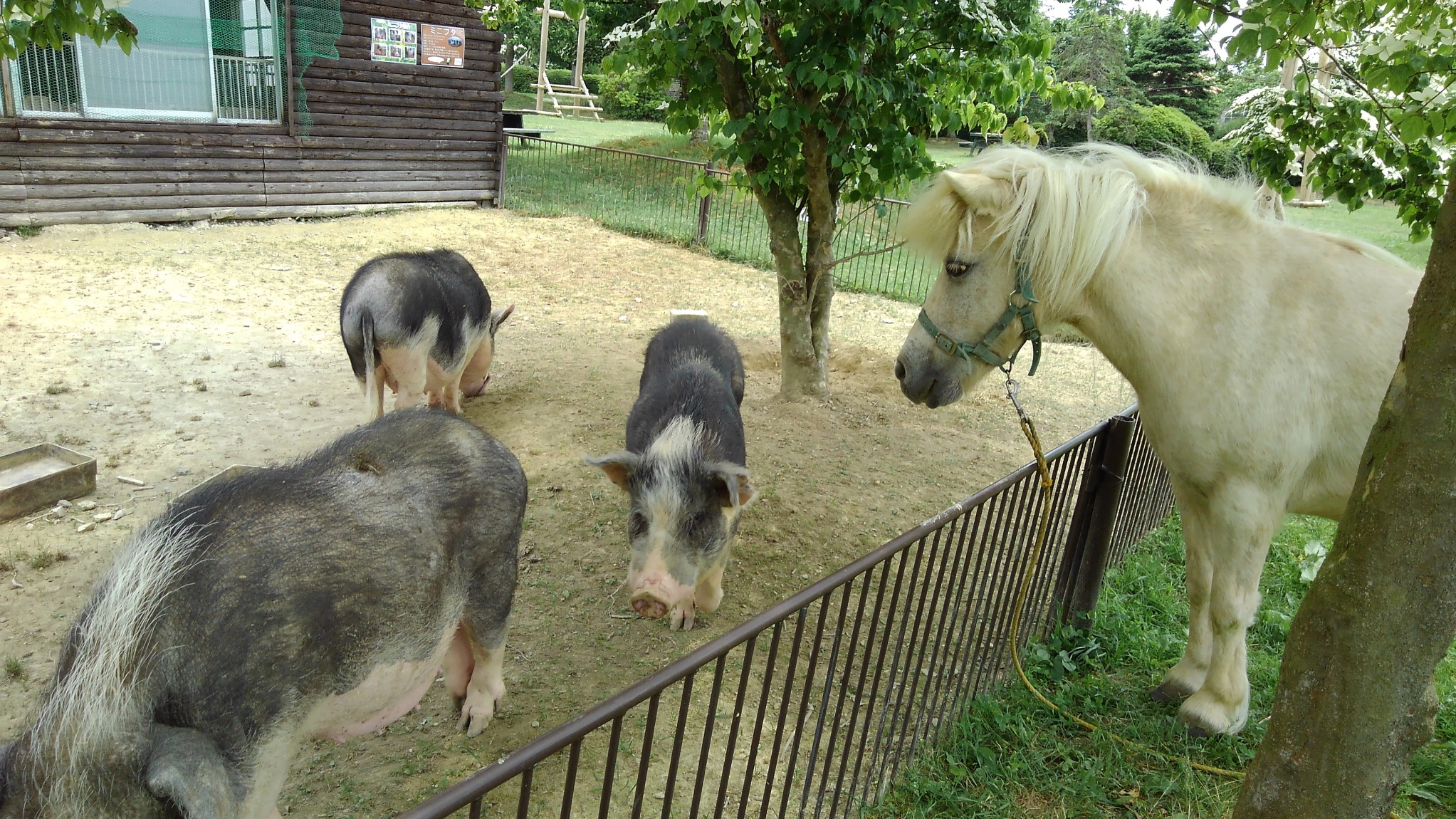 土日祝、わんぱく広場の木に繋がれているポニーのユキちゃんも、暑いので木陰でボーッとミニブタたちを眺めていました笑