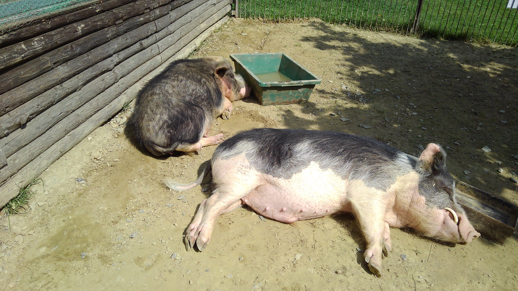 ミニブタたちは、ひっくり返って日向ぼっこです。