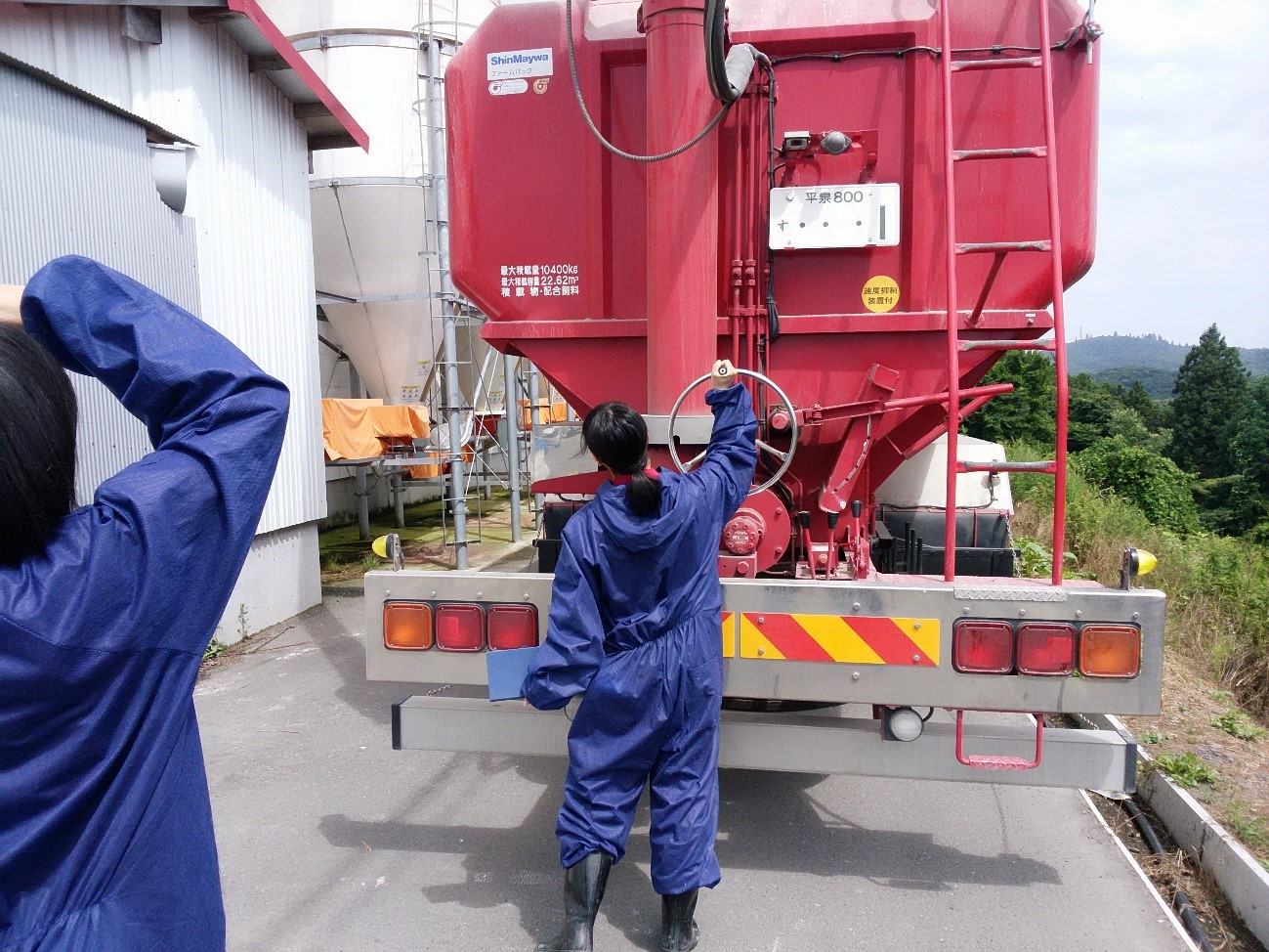 エサを運ぶバルク車による配送も経験しました!ハンドルが思ったより重く大変そうでした(+_+)