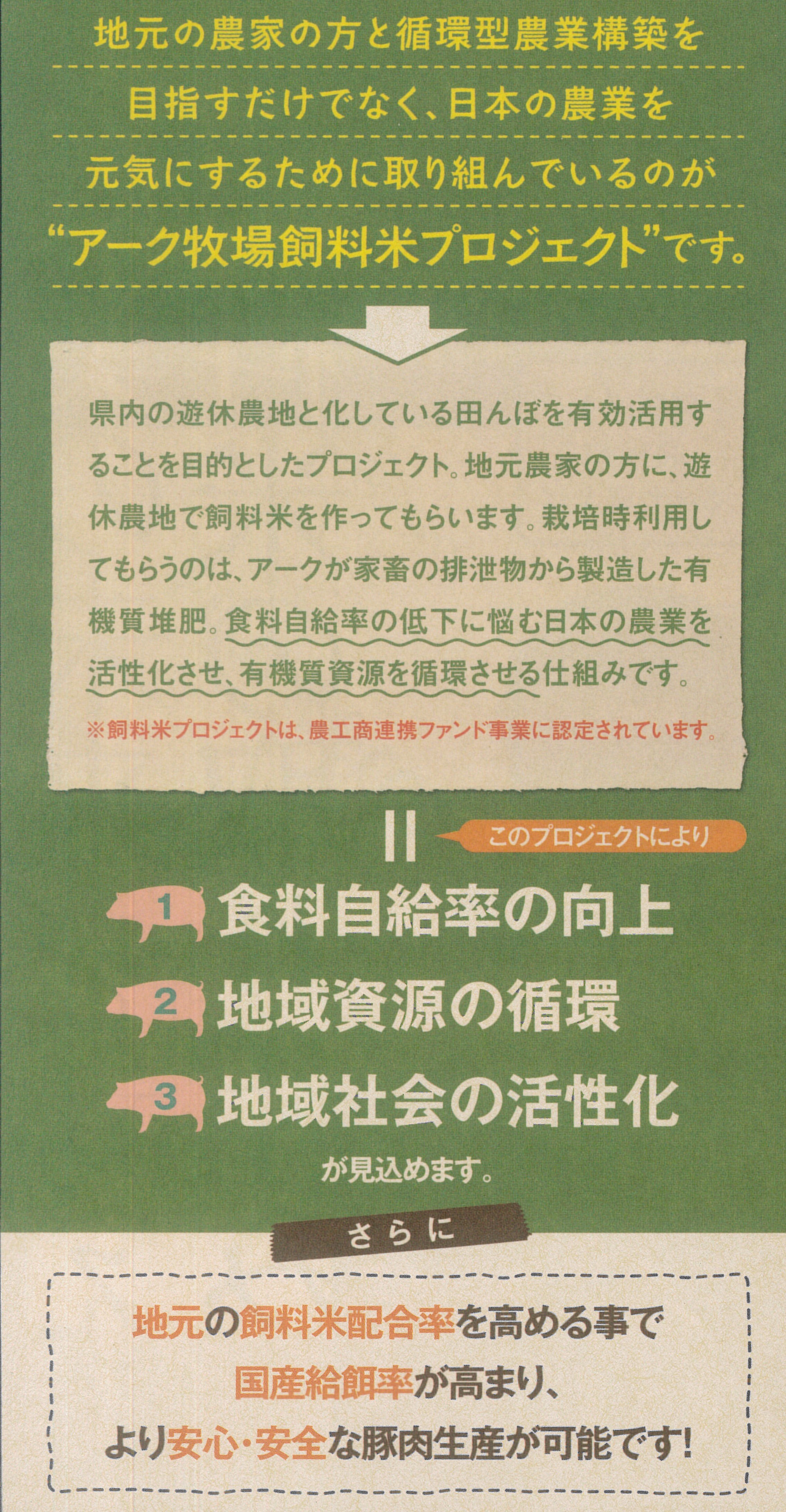 そうは言いながらも、アークの豚肉や卵を生産するためのエサのほとんども海外から輸入しているという現実です(もちろん非遺伝子組み換えのものを最優先にしていますが)。